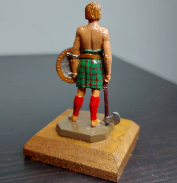 54mm scale 1 figure on wood base, 5th century Caledonian warrior. From the Ghysbrecht van Brussel collection, full metal restoration, full repaint.