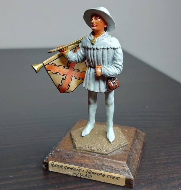 54mm scale 1 figure on wood base, 1430 century Burgundy trumpeter/herald. From the Ghysbrecht van Brussel collection, full metal restoration, full repaint.