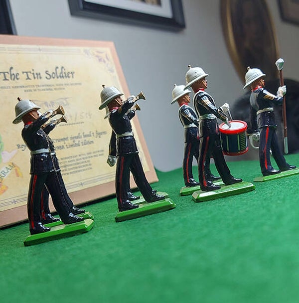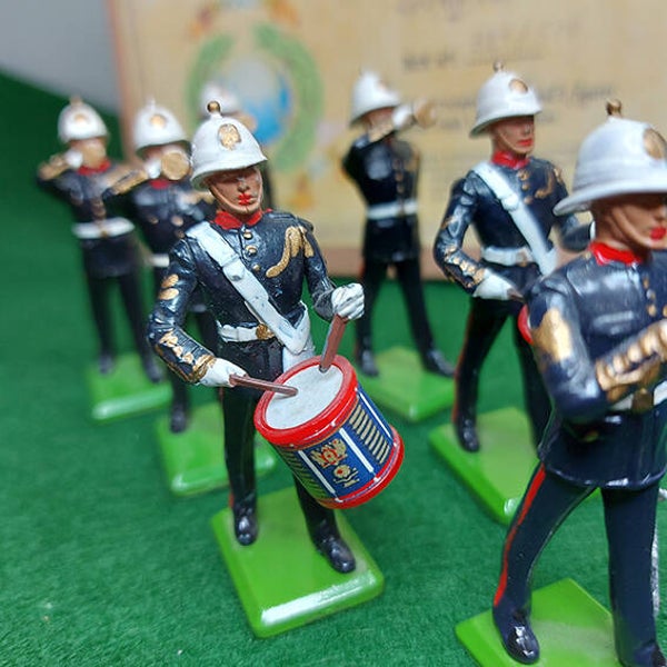 54mm Royal Marines trumpet section, W. Britains 'refurbished' figures 1980s, comes in a sturdy classic box, 7 pieces. From the Clarysse collection. Comes in a traditional sturdy box with box label artwork.