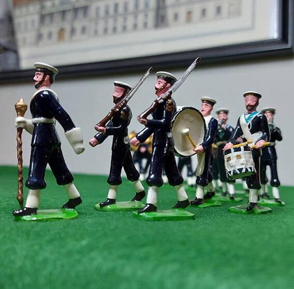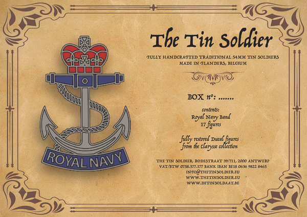 54mm Royal Navy full band, repainted & restored Ducal figures, comes in a sturdy classic box, 17 pieces. From the Clarysse collection. Comes in a traditional sturdy box with box label artwork.