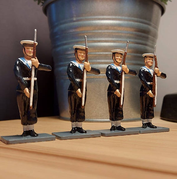 54mm Royal Navy sailors at attention for parade, repainted & restored Britains figures from 2001, comes in a sturdy classic box, 4 pieces. From the Clarysse collection. Comes in a traditional sturdy box with box label artwork.