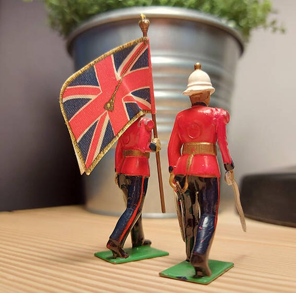 54mm Royal Marines 2 figures - standard brearer, officer. repainted & restored Britains figures 1991, comes in a sturdy classic box, 2 pieces. From the Clarysse collection. Comes in a traditional sturdy box with box label artwork.