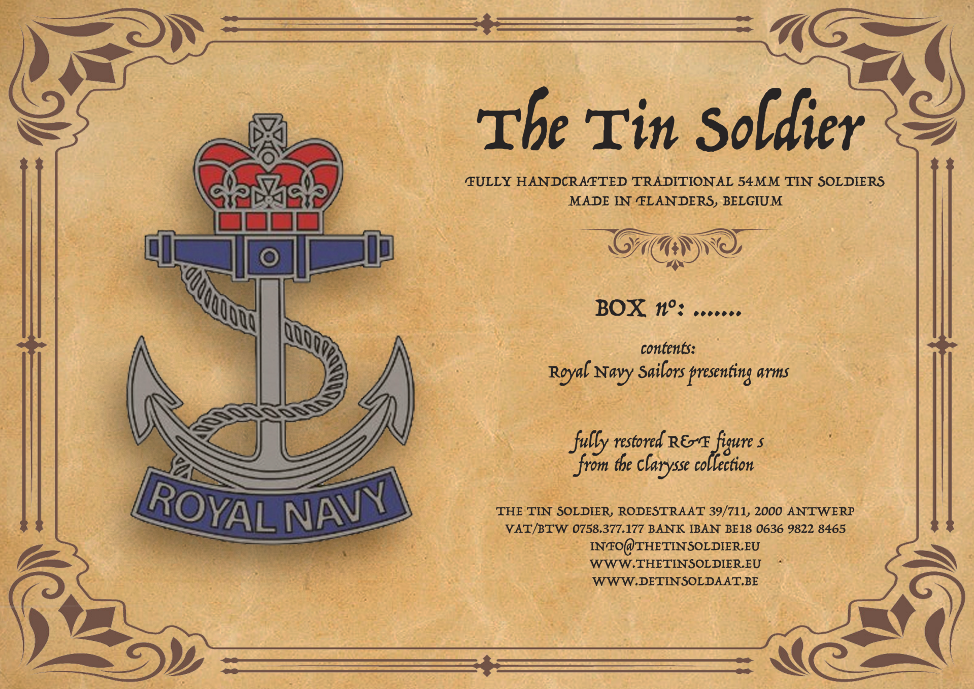 54mm Royal Navy sailors at attention for parade, repainted & restored R&F figures, comes in a sturdy classic box, 3 pieces. From the Clarysse collection. Comes in a traditional sturdy box with box label artwork.