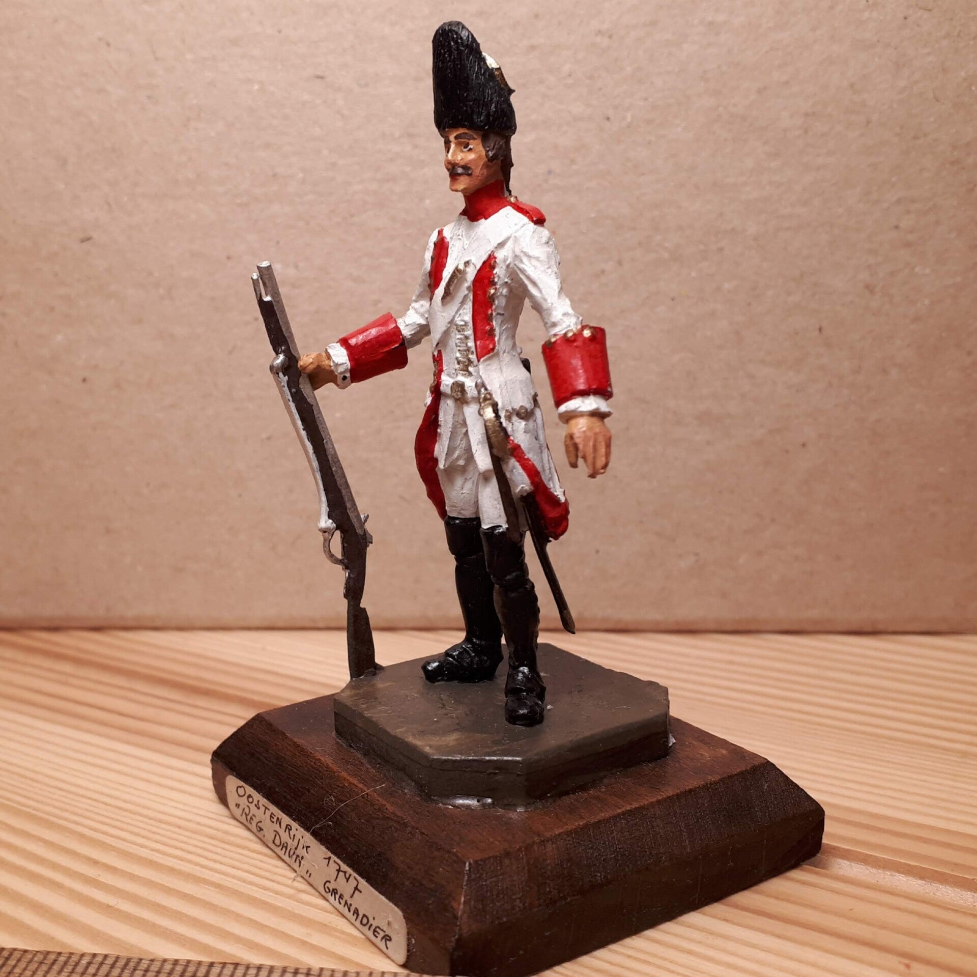 54mm scale 1 figure on wood base, Austria grenadier 1747 regiment Daun. From the Ghysbrecht van Brussel collection, full metal, repainted.