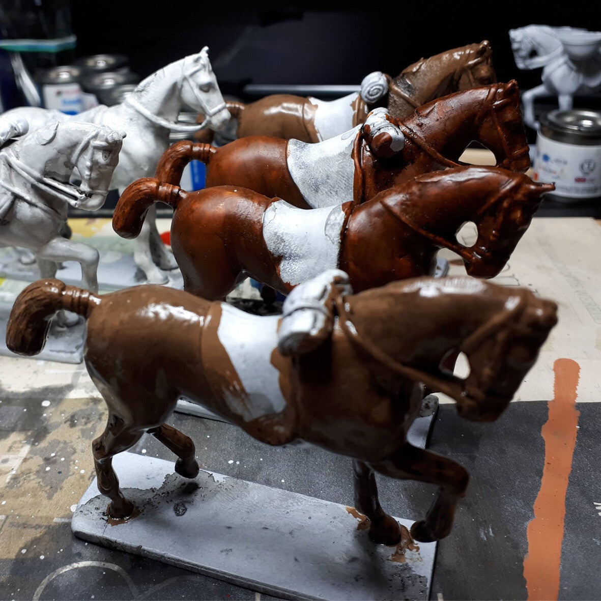 The 54mm & 40mm soldiers are cast from ‘white metal’, in this case an alloy of 50 percent tin and 50 percent lead. Lead for sturdiness, tin so it is somewhat pliable and therefore ‘workable’. Each soldier is cast in several pieces, in vulcanised rubber moulds produced by ourselves, Prince August® and Schildkröt. Every piece is then sanded and brushed by hand, before being assembled and fastened either with glue or by soldering. A base coat of white paint is then applied. All individual colours are up next. They are painted by hand in enamel paint, each colour being left to dry for a minimal of eight hours. Often a colour coat is applied twice. When completed, a final coat of varnish finishes off the process. Restoration of older figures also happens in our workshop.
